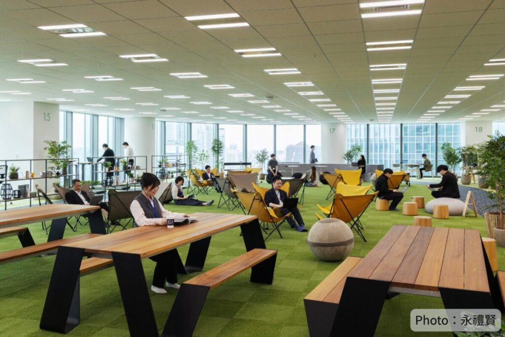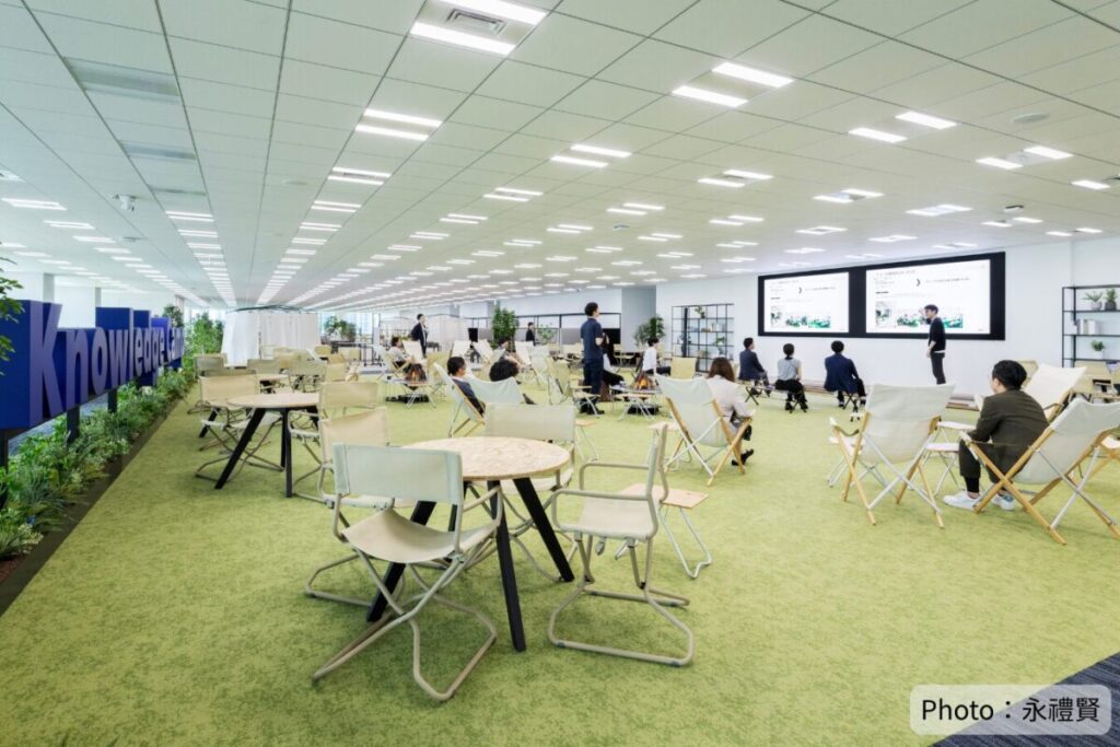 その下にあるのが「Knowledge Camp」で、キャンプ場のように緑に溢れ、屋外家具が置かれた非日常の社内コワーキングスペースです。KDDIグループ会社の方も自由に使えるため、さらに大きなコミュニケーションを創出する拠点となります。