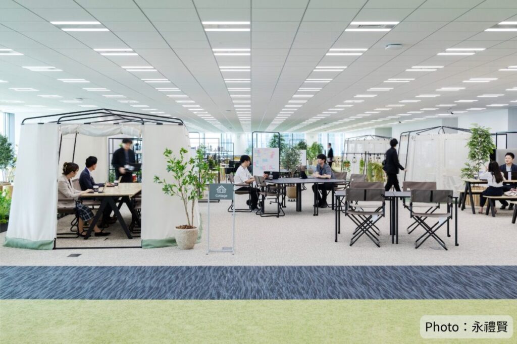 こちらが「Knowledge Camp」です。キャンプ場のような空間でリラックスしながらの業務ができる場所になっています。