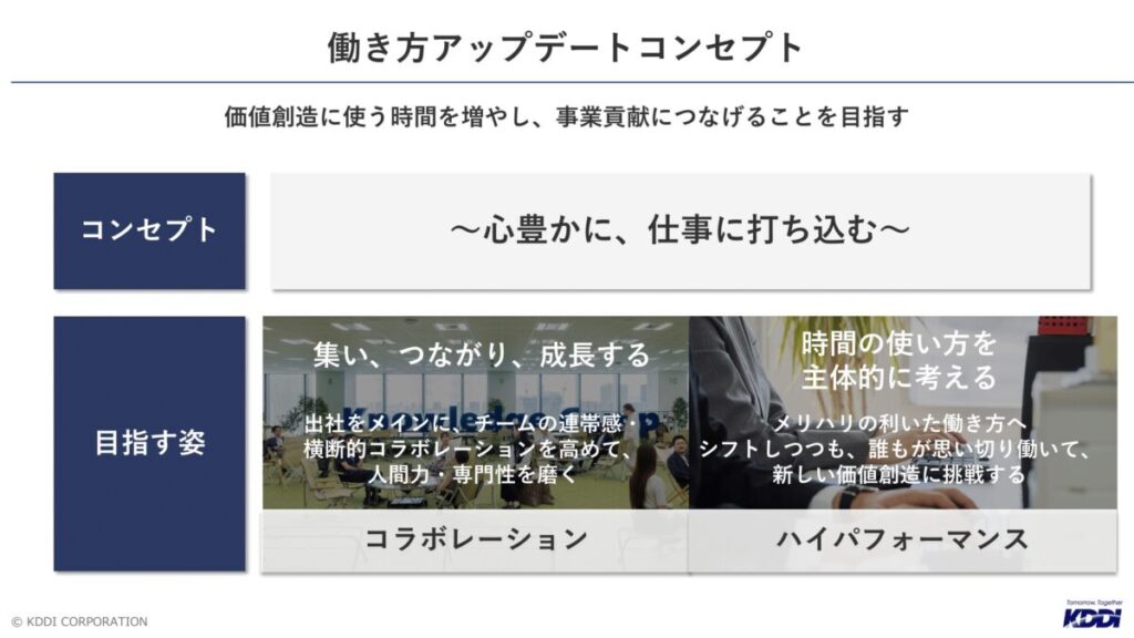 私たちは、「価値創造に使う時間を増やし、事業貢献につなげていく」ことを目指して、2024年から働き方のアップデートを進めてきました。今回の新本社は、その動きをさらに加速させる位置づけになっています。働き方アップデートのコンセプトは「心豊かに、仕事に打ち込む」で、このコンセプトのもと「集い、つながり、成長する」「時間の使い方を主体的に考える」という2つを目指す姿として掲げています。