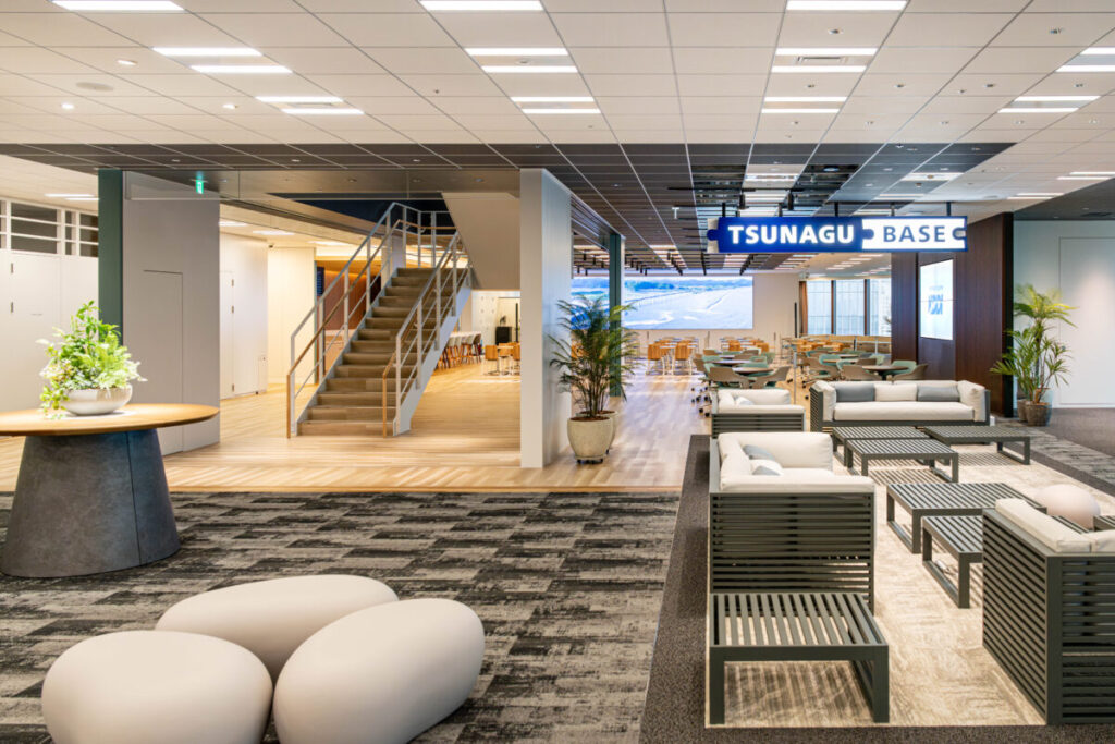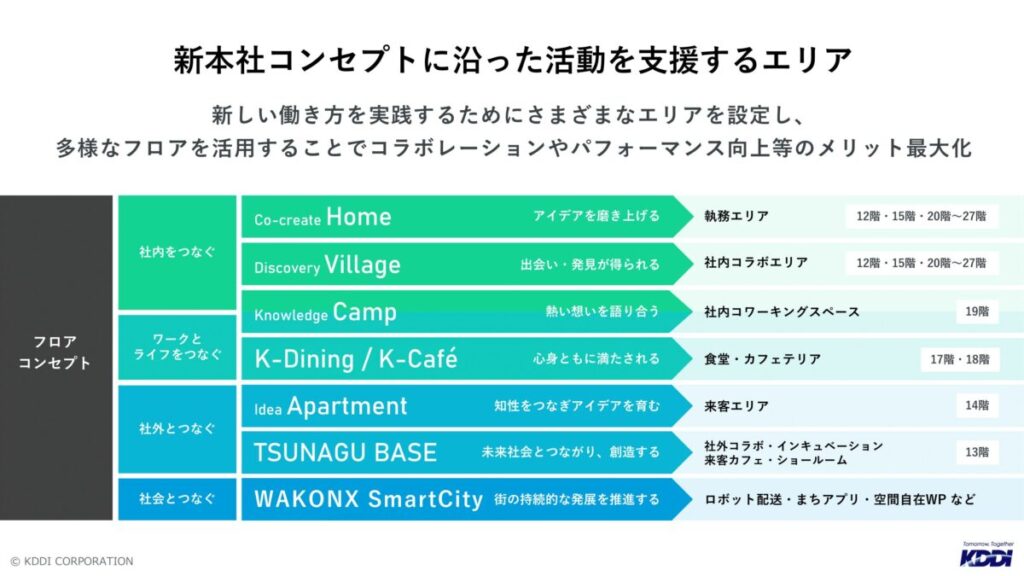 最後が「TSUNAGU BASE」、社外とのコラボエリアです。このエリアはコネクタブルと深く関連しており、13、14階はお客さまやパートナーの方をお迎えする場所になっています。お客さまやパートナーとのコラボレーションを加速し、KDDIの強みである通信、デジタルデータやAIといった「つなぐチカラ」と、「お客さまやパートナーの強み」を”掛け算”することで、社会に新しい価値を創出、発信する拠点です。