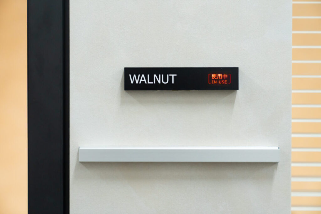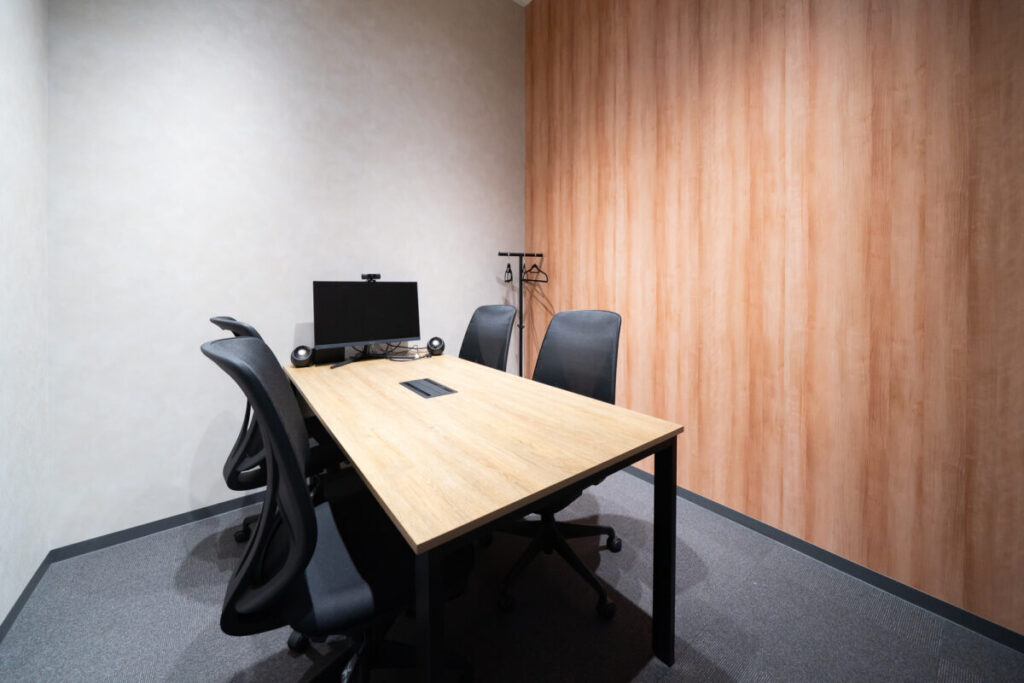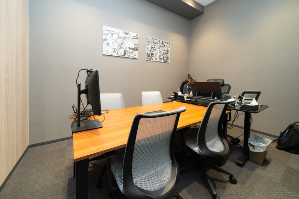 フリースペースの先には会議室を4部屋設置しました。旧オフィスでは専用の会議室がなく、執務室でウェブ会議をすると周りの音が入ってしまう課題がありました。カラオケ店の一室を会議室として利用できるサービスなども活用していました。