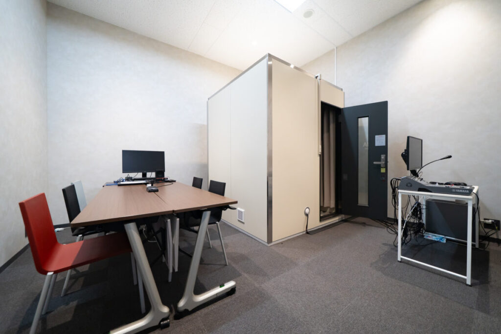 新オフィスでは、取材などの撮影でも使用できるようシンプルかつスタイリッシュな会議室を設けました。カラオケ店まで移動していた頃は移動時間がストレスでしたが、今は同じフロアに十分な部屋数が確保でき、とても快適です。スタジオ利用者の待合室としてご利用いただいたり、ここで取材撮影を行うこともあります。