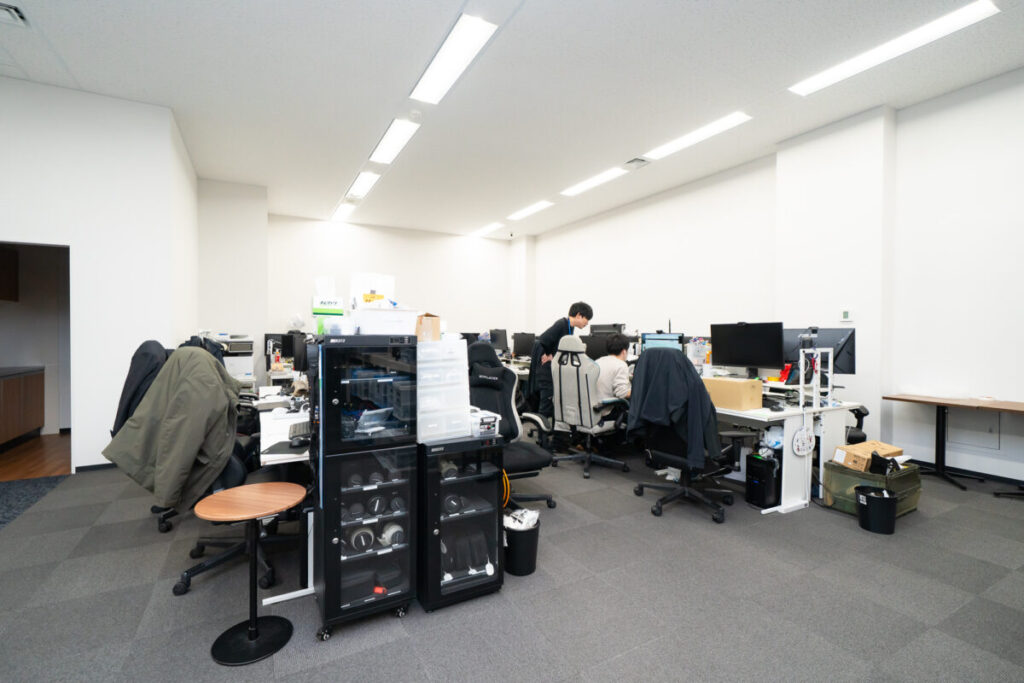 この量の機材を管理、メンテナンス、撮影準備をするにはスペースが必要で、かなり効率が上がったという声もあります。また、撮影以外の準備と片付けの時間も多く、そこでコミュニケーションをとり互いを鼓舞しながら進めることもあります。執務室が分かれたことで、スペースだけでなく、リラックスした状態で会話でき、場合によっては大盛り上がりする。そんな私たちらしい働き方を尊重してもらえたことをとても嬉しく思っています。