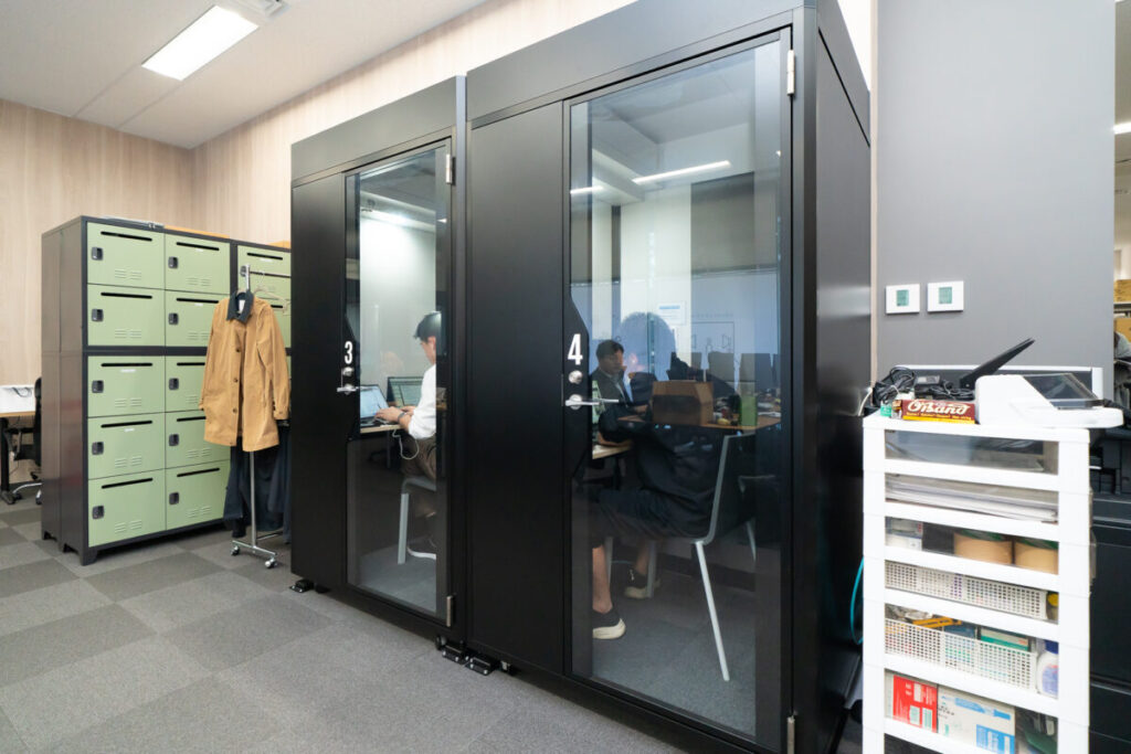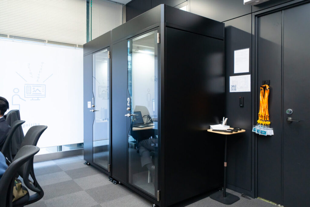 映像本部以外の執務室には、4台のテレカンブースを設置しました。社内外問わずウェブ会議の多い弊社では、使用頻度はかなり高く、導入してよかったものの一つです。
