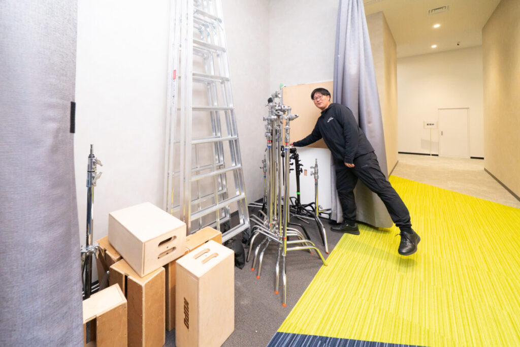 まず、私たちが扱う資材には様々な形、大きさ、量があり、撮影によって必要なものも異なります。段差がない場所に格納すること、また扉ではなくカーテンで仕切ることで、一気に物が置きやすくなるんです。多少カーテンに当たっていても問題なく管理できるので、そういったちょっとした工夫でかなり社員のストレスが軽減できるんですよ。