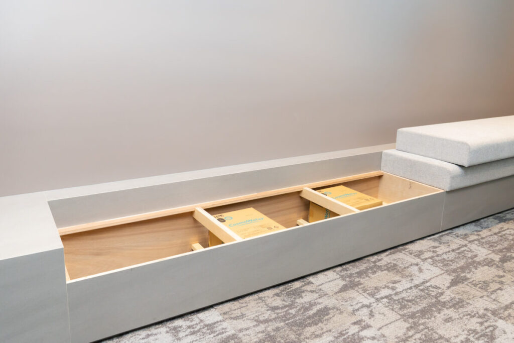 こちらの会議室の壁沿いには、多機能ベンチを導入しました。普段は椅子として使えますが、救護時には横になれるスペースにもなり、さらに収納もできるんです。