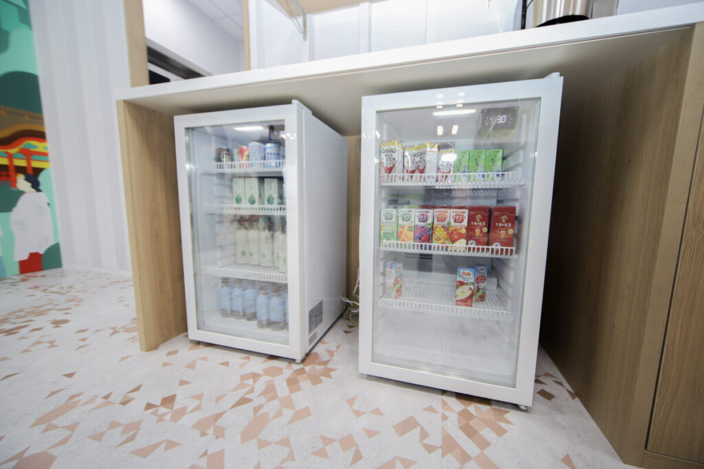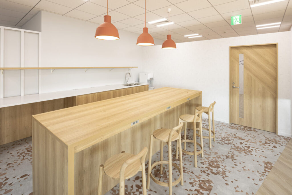 給湯室のようなクローズドな場所ではなく、誰でもふらっと立ち寄れる造りが特徴です。