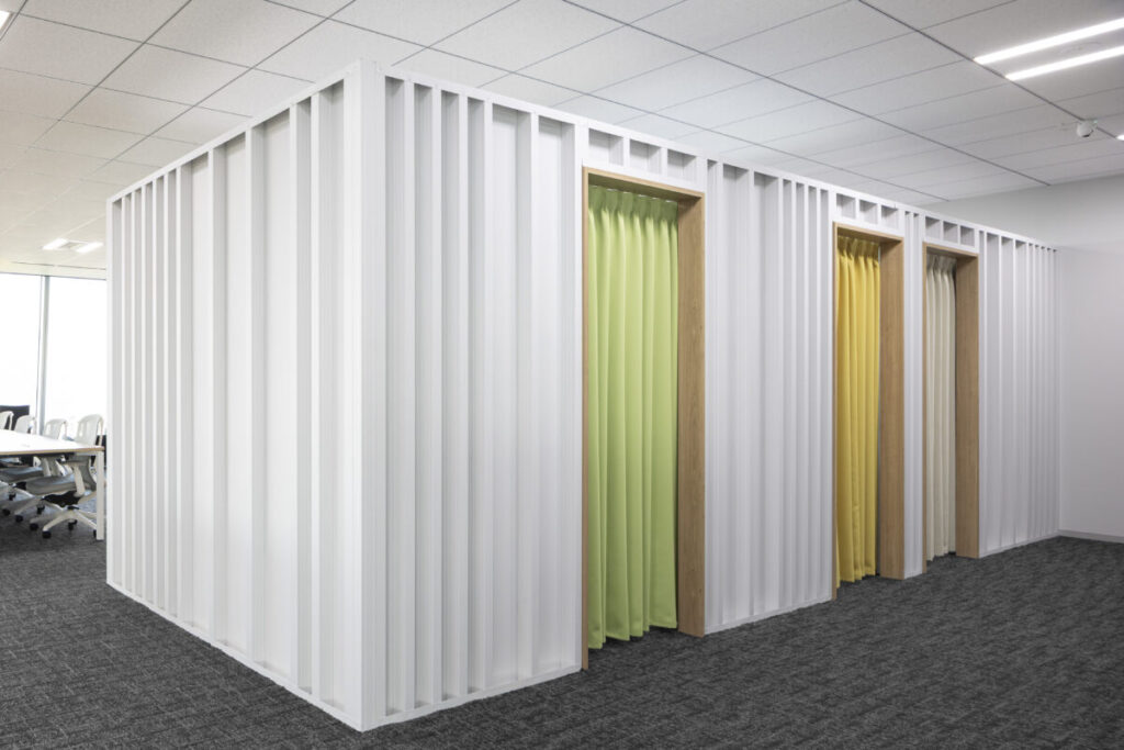開発プロジェクトなど、チームとして一定時間まとめて集中したい時に使っています。議論しながら一気に仕上げたいケースも多いので、通常の席とは別に、専用の集中空間として設計しました。