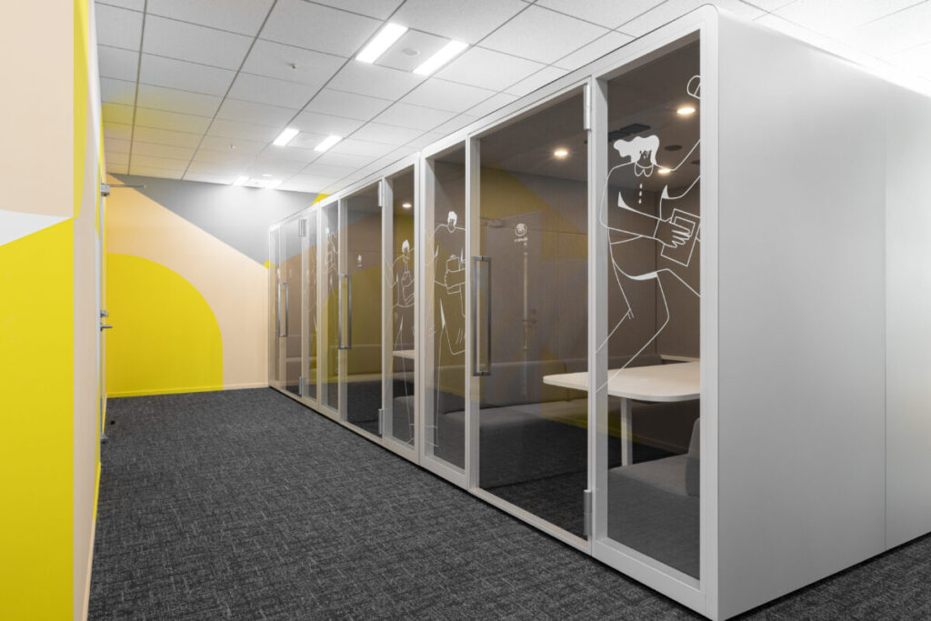 3〜4名で使える個室ミーティングブースです。周囲の音を気にせずに打ち合わせやオンライン会議ができるよう、防音をしっかり整えています。せっかくなので遊び心を入れようという話になって、福岡らしい食の名前をつけました。