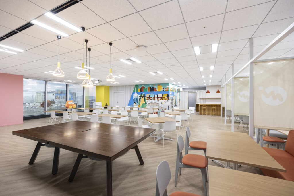 ここはランチやチームミーティングに使える多目的スペースです。チーム単位で集まって議論したり、作業できるコラボレーションエリアとして設計しました。メンバーが気軽に集まれる、使い勝手のいい場所になればと思っています。
