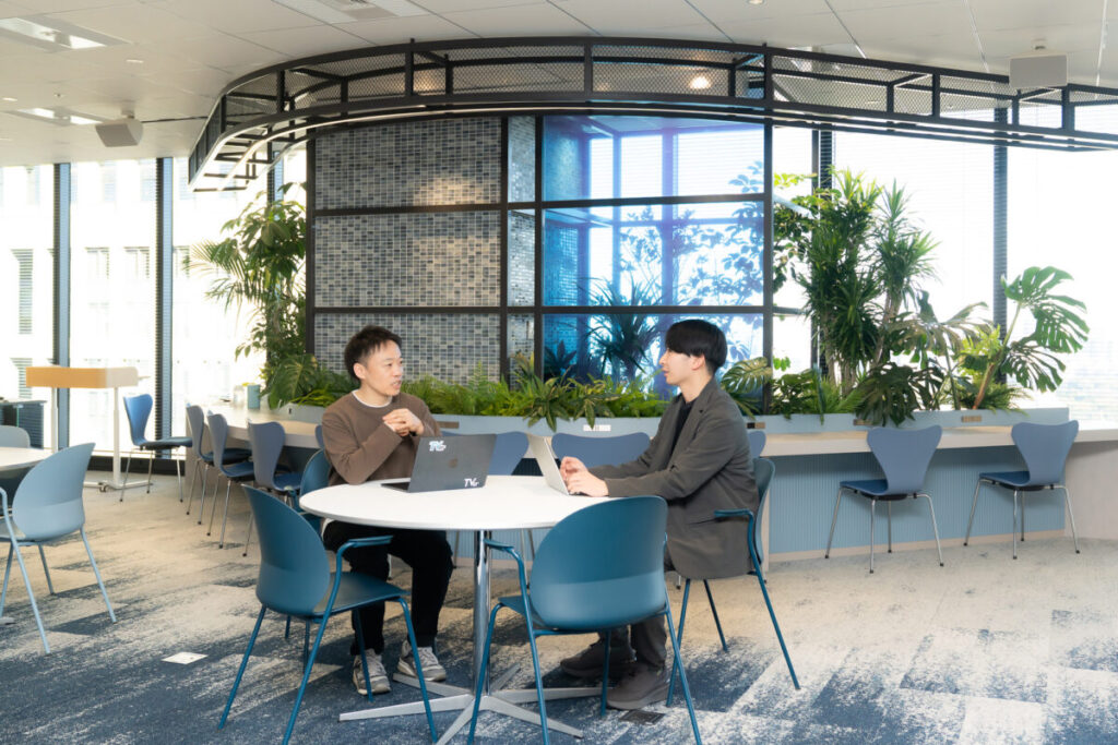 コミュニケーションを取る場として、活用していただいていることが多いですね。当初、内装会社さんからの提案は真ん中にテーブルがあり、木が植わっていたのですが、社内イベントにも使いたいという要望があったため、今の形に落ち着きました。おかげで、イベントも開きやすい場になったと思っています。
