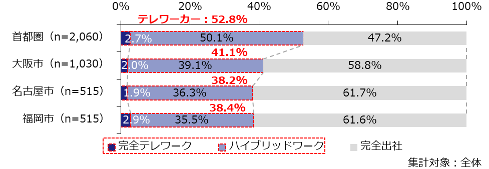 この調査によると、調査対象者の働き方を「完全テレワーク」「ハイブリッドワーク」「完全出社」の3つに分類した結果、テレワーカー(完全テレワーク+ハイブリッドワーク)の割合は首都圏で52.8%に達しました。地方都市でも約4割がテレワーカーとなっており、テレワークがある程度定着したことが分かります。