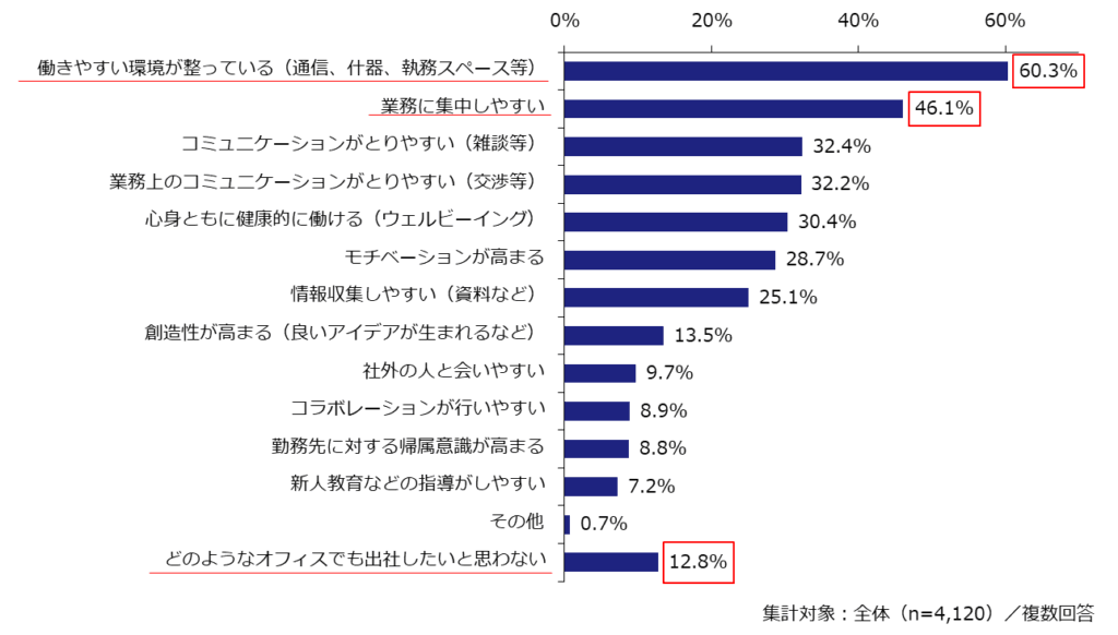 次に「業務に集中しやすい」が46.1%で続きました。オープンすぎる空間では周囲の会話や視線が気になり、集中作業が妨げられるというケースもあるでしょう。