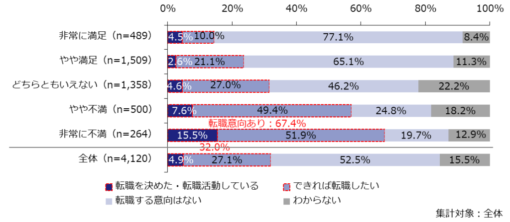 企業が目的を明確にせず「とりあえず出社」を強制することが、従業員の深刻な不満と課題に直結していることを示唆します。実際、働き方に対する満足度が低いグループほど、現在の勤務先からの転職意向が高い傾向が明確に見られており、単純な出社強制は従業員のエンゲージメントと企業の競争力を同時に下げる、逆効果な施策になりかねません。